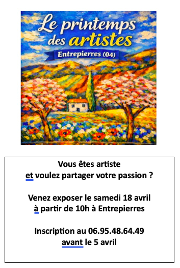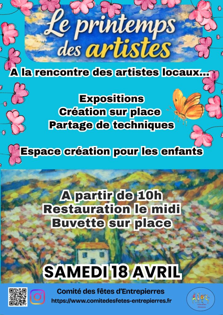 Eric, un habitant d’Entrepierres, nous a proposé l’idée de rassembler les artistes du village pour une journée au printemps. Peinture, sculpture, poterie, céramique, photographie etc.